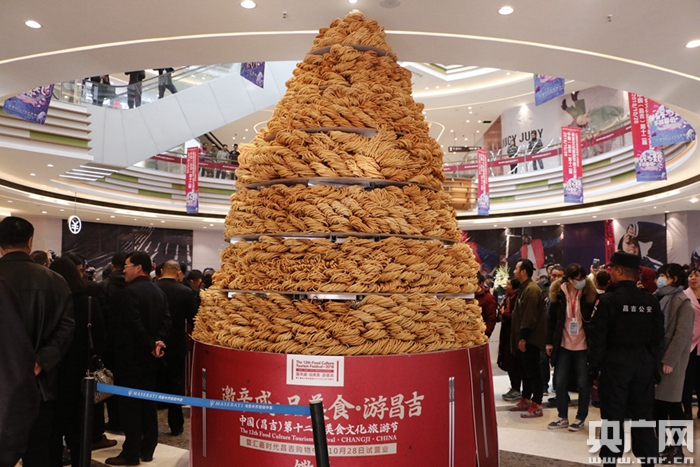 由馕和馓子組成的巨型“美食塔”(央廣網(wǎng)見(jiàn)習(xí)記者 韓雪瑩 攝)