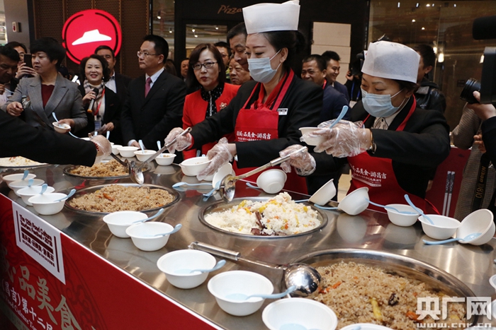 在活動(dòng)主會(huì)場(chǎng)匯嘉時(shí)代購(gòu)物中心一層大廳,“巨型美食”引得人們駐足流連。由馕和馓子組成的巨型“美食塔”形成了一道特色景觀,顧客紛紛前去合影留念。“美食塔”背后,巨大盛器中的新疆本土名吃大盤雞散發(fā)出濃濃香味,刺激著眾多游客味蕾。在大盤雞展位另一側(cè),匯聚了新疆眾多品種的抓飯,羊腿、鷹嘴豆、葡萄干等各式抓飯映入人們眼簾,也展現(xiàn)著新疆人生活的豐富多彩。而在被譽(yù)為“新疆最猛燒烤”的“海陸空”燒烤展位前,各類烤肉和素食食材融為一體,味道鮮美,視覺(jué)呈現(xiàn)如同“航空母艦”般壯觀。