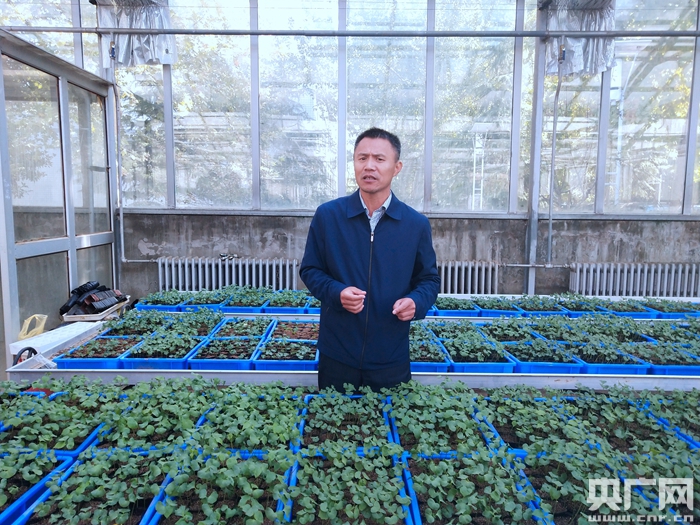 嚴(yán)根土在中棉所棉花培育基地(央廣網(wǎng)記者 汪寧 攝)