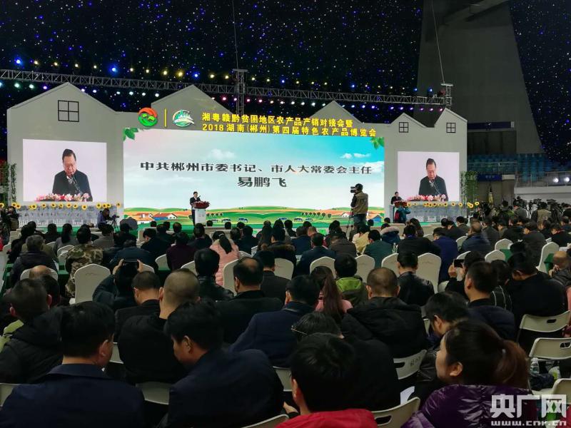 央廣網(wǎng)長(zhǎng)沙12月8日消息(記者鄧文輝)由國(guó)家農(nóng)業(yè)農(nóng)村部舉辦,農(nóng)業(yè)農(nóng)村部市場(chǎng)與信息化司、湖南省農(nóng)業(yè)農(nóng)村廳、郴州市人民政府、中國(guó)農(nóng)產(chǎn)品市場(chǎng)協(xié)會(huì)承辦的湘粵贛黔貧困地區(qū)農(nóng)產(chǎn)品產(chǎn)銷對(duì)接活動(dòng)暨2018湖南(郴州)第四屆特色農(nóng)產(chǎn)品博覽會(huì),于2018年12月7日在湖南郴州開幕。湘粵贛黔相關(guān)部門和湖南省部分地市州的領(lǐng)導(dǎo)和嘉賓,國(guó)外嘉賓、專家學(xué)者、國(guó)內(nèi)外企業(yè)代表、采購(gòu)代表等800余人參加了開幕式。