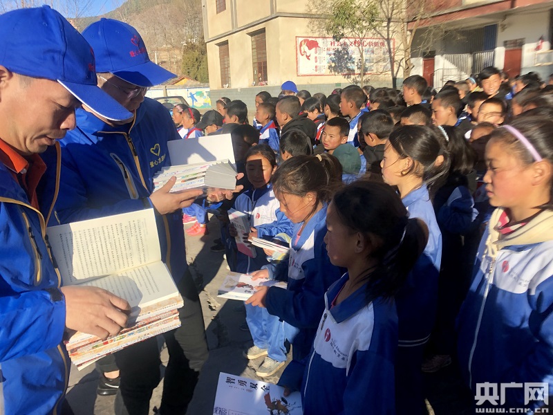 志愿者給學(xué)生們發(fā)放捐贈(zèng)圖書 (央廣網(wǎng)實(shí)習(xí)記者池月婷 攝)