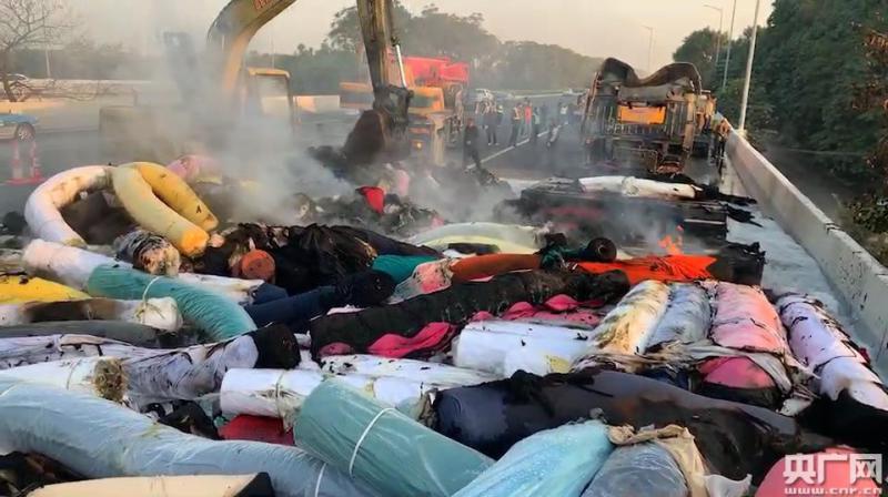 由于事故車輛堆疊多層布匹,有復(fù)燃危險,消防部門立即協(xié)調(diào)相關(guān)部門調(diào)來吊車、挖掘機,將布匹清理開,在用泡沐進行覆蓋,防止其再次復(fù)燃。