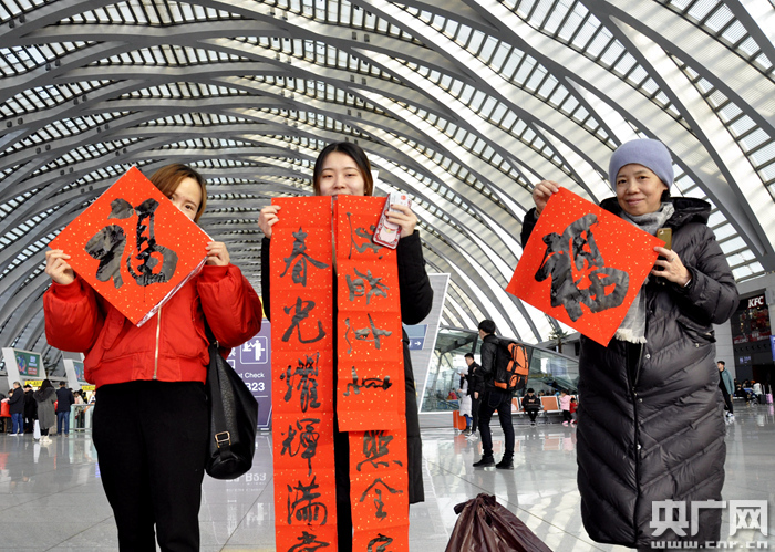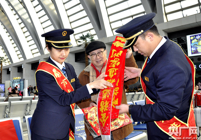 活動(dòng)現(xiàn)場(chǎng),候車旅客拿著一幅幅新春對(duì)聯(lián)和大福字喜笑顏開,紛紛通過微信、電話等方式向家人和朋友提前傳遞著新年的信息,并稱贊車站服務(wù)旅客的好舉措。活動(dòng)營造了文明祥和、溫馨和諧的節(jié)日氣氛,展示了高鐵車站優(yōu)質(zhì)服務(wù)形象,體現(xiàn)了“三個(gè)春運(yùn)”的服務(wù)理念。