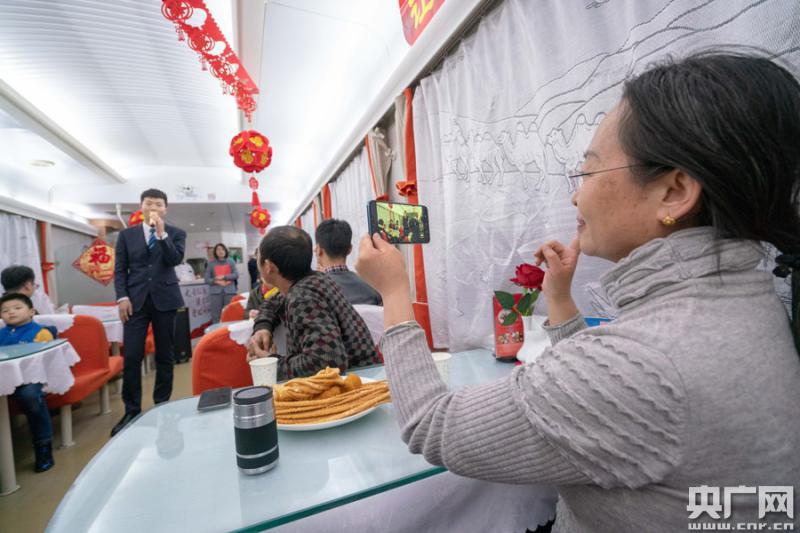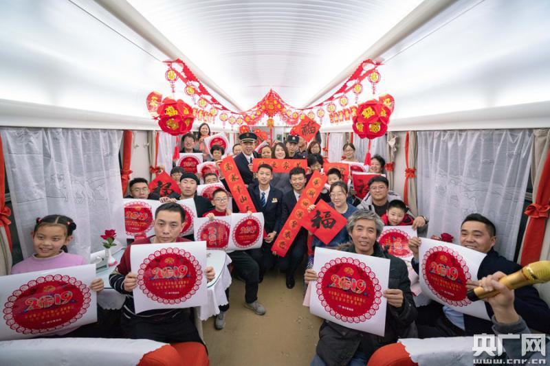 春意盎然的車(chē)廂里,大家都陶醉在乘務(wù)人員的歌聲中(央廣網(wǎng)發(fā) 通訊員方正 攝)
