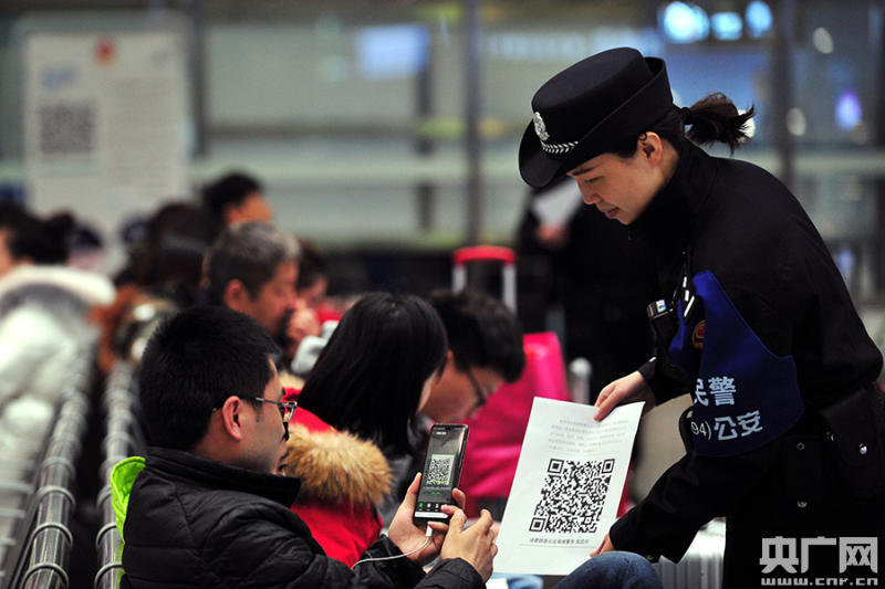 2月10日,民警在雙流機(jī)場(chǎng)高鐵站向旅客宣傳推廣微警務(wù)服務(wù)平臺(tái)(央廣網(wǎng)發(fā) 通訊員供圖)