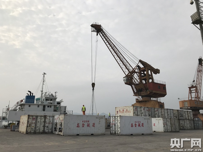 廈門同益碼頭工作人員對(duì)臺(tái)灣貨船進(jìn)行卸貨作業(yè)(央廣網(wǎng)記者 陳庚 攝)