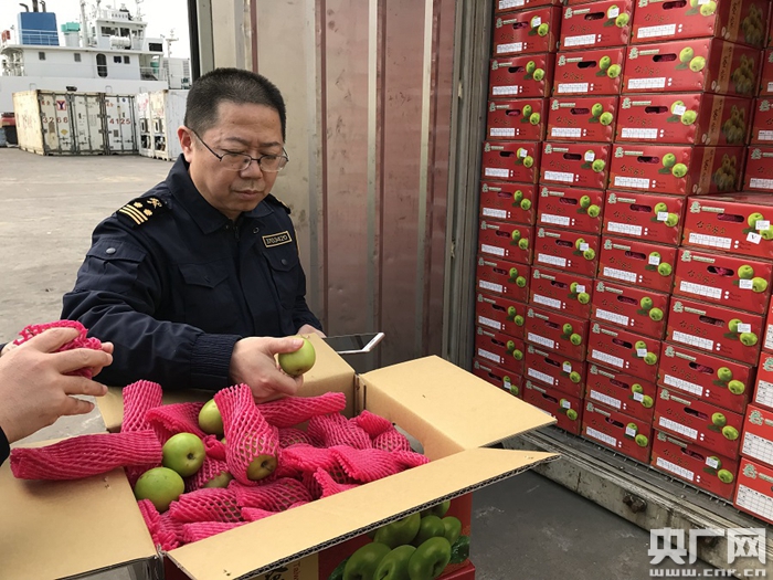 廈門海關(guān)工作人員對(duì)臺(tái)灣水果現(xiàn)場(chǎng)查驗(yàn)(央廣網(wǎng)記者 陳庚 攝)