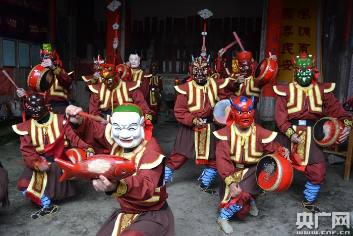 央廣網(wǎng)三明2月16日消息(記者萬存靈)沉重的鼓點、輕快的木魚、15個“面具人”穿著一身紅裝、腿上綁著藍布條、蹬著一雙草鞋,在福建省三明市泰寧縣大源鄉(xiāng)里,一支儺舞表演隊正在當?shù)貒朗阶陟衾锷涎葜爬系奈璧浮?/p>