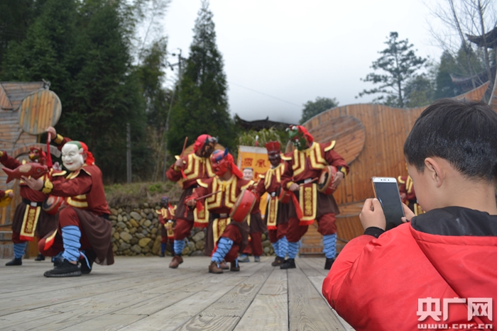 精彩的儺舞表演吸引了村莊許多小孩子駐足拍照(央廣網(wǎng)記者 萬存靈 攝)
