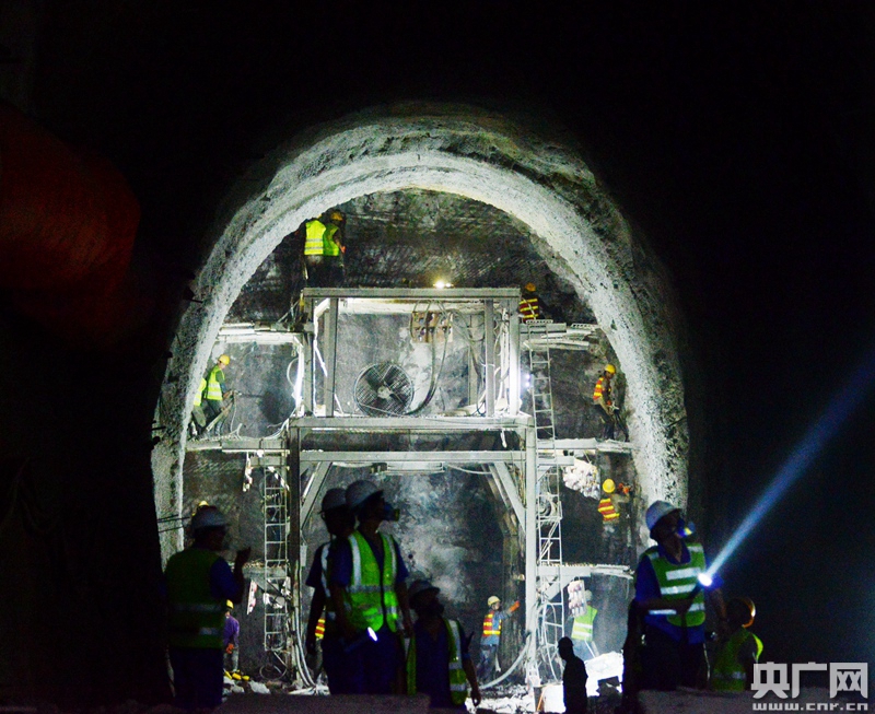 施工人員在安裝了有害氣體自動(dòng)監(jiān)測(cè)報(bào)警裝置的洞內(nèi)作業(yè)(央廣網(wǎng)發(fā) 張偉明 攝)