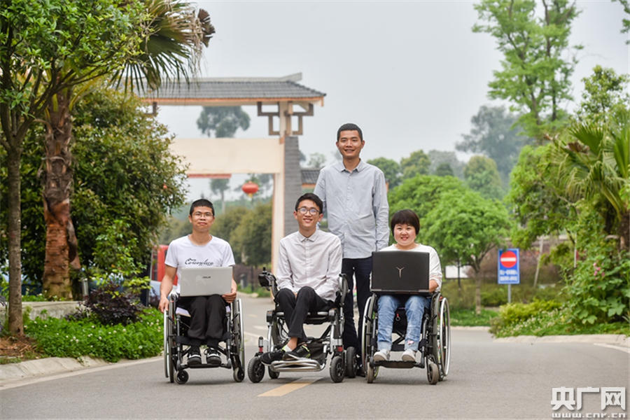 楊添財(中間坐輪椅者)和吳云(站立者)看望在家辦公的殘疾人員工(央廣網(wǎng)發(fā) 李康 攝)