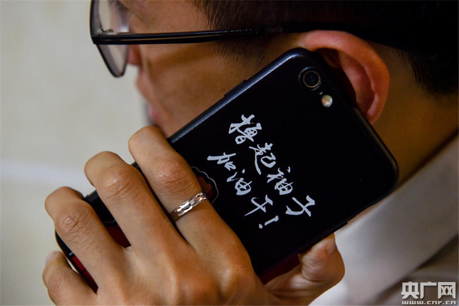 楊添財特意選了這個“擼起袖子加油干”的手機殼(央廣網(wǎng)發(fā) 李康 攝)
