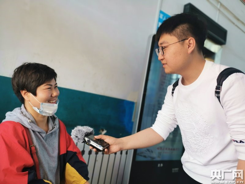 央廣網(wǎng)記者喬仁慧正在采訪準(zhǔn)備乘坐高考專列的考生(央廣網(wǎng)記者 馮志遠(yuǎn) 攝)