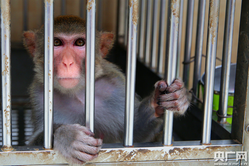 在黃某家陽臺上,民警發(fā)現(xiàn)這只被關(guān)在鐵籠里的猴子。雖然長期生活在鐵籠里,但這只猴子的野性絲毫不減,身體比較壯實?吹矫窬絹,猴子在鐵籠里齜牙咧嘴,上躥下跳,顯得十分躁動。