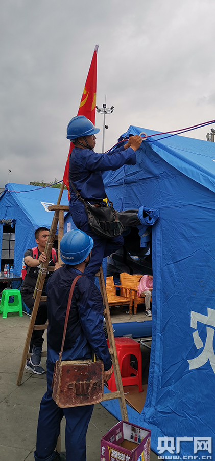電力公司員工給帳篷接照明燈(央廣網(wǎng)記者 劉濤 攝)