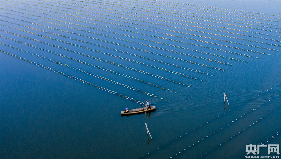 10月20日,在江西九江市都昌縣新妙湖畔珍珠養(yǎng)殖基地,漁民泛舟湖面(央廣網(wǎng)發(fā) 通訊員傅建斌 攝)