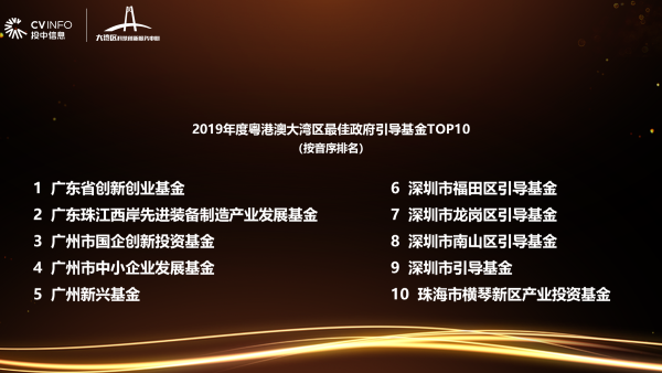 大會現(xiàn)場發(fā)布了“2019年度粵港澳大灣區(qū)最佳創(chuàng)業(yè)投資機構(gòu)榜單”“粵港澳大灣區(qū)最具潛力科創(chuàng)企業(yè)榜”。本次榜單共揭曉“2019年度粵港澳大灣區(qū)最佳創(chuàng)業(yè)投資機構(gòu)”“2019年度粵港澳大灣區(qū)最佳私募股權(quán)投資機構(gòu)”“2019年度粵港澳大灣區(qū)最佳早期創(chuàng)業(yè)投資機構(gòu)”“2019年度粵港澳大灣區(qū)最佳天使投資人”“2019年度粵港澳大灣區(qū)新銳創(chuàng)業(yè)投資機構(gòu)”“2019年度粵港澳大灣區(qū)最佳政府引導(dǎo)基金”六大獎項。