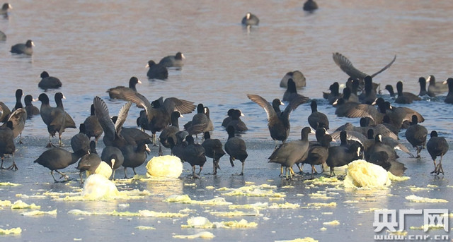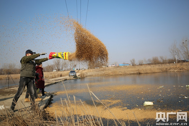 志愿者對越冬鳥類進(jìn)行投食救濟(jì),共投放救濟(jì)糧3000余斤(央廣網(wǎng)記者 王偉 攝)