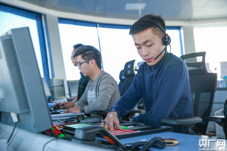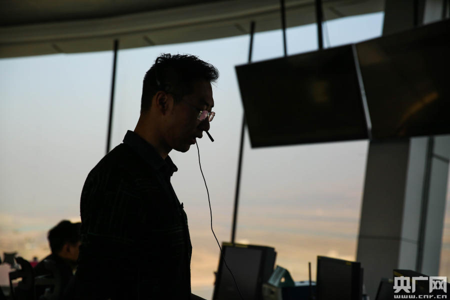 民航青?展芊志挚罩薪煌ü苤茊T朱小龍正在指揮離場航空器(央廣網(wǎng)發(fā) 張得力 攝)