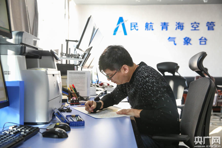 青海空管分局氣象臺預(yù)報員正在專心繪制氣象高空圖(央廣網(wǎng)發(fā) 張得力 攝)