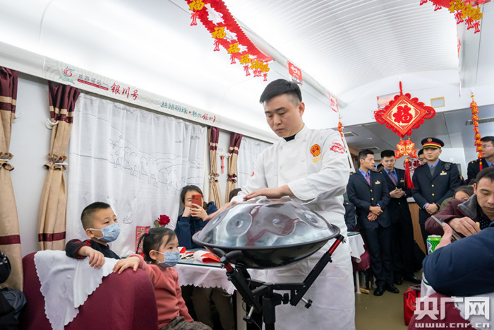 19時(shí)20分,列車春晚正式拉開(kāi)帷幕。列車員馬東一曲悠揚(yáng)的吉他彈唱《寫給黃淮》,唱出了對(duì)家人和故鄉(xiāng)的思念,唱出了對(duì)歸家游子的祝福。列車廚師閆乃峰的手碟演奏《煙雨青黛》吸引了眾多旅客的目光,空靈的曲調(diào)、精湛的技藝,引來(lái)陣陣贊嘆。