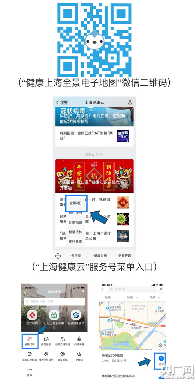 如何使用查詢功能?有三種方法:第一,直接掃描“健康上海全景電子地圖”二維碼,然后選擇“發(fā)熱門診”;第二,關(guān)注“上海健康云”微信服務(wù)號(hào),通過下方菜單欄“云功能-健康e圖”進(jìn)入首頁后,選擇“發(fā)熱門診”分類,就可快速查詢就近發(fā)熱門診,選擇熟悉的導(dǎo)航方式就能一鍵導(dǎo)航直達(dá);第三,下載“健康云”App,注冊(cè)進(jìn)入首頁后,點(diǎn)擊“健康地圖”功能后,選擇“發(fā)熱門診”進(jìn)入。