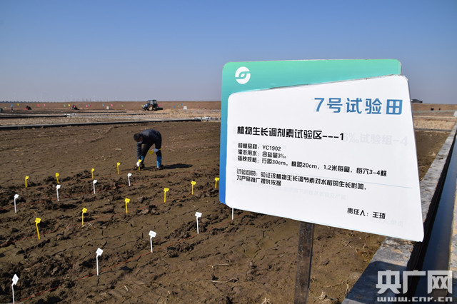 工人正在青島市城陽區(qū)桃源河畔的鹽堿地試驗(yàn)田中進(jìn)行土地整理作業(yè)(央廣網(wǎng)記者 王偉 攝)
