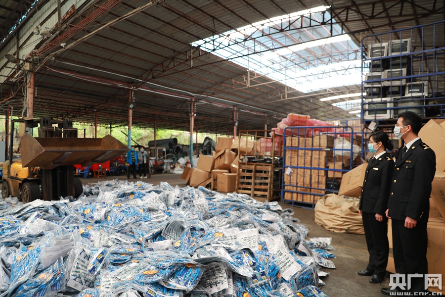 廣州海關(guān)所屬南沙海關(guān)關(guān)員現(xiàn)場(chǎng)監(jiān)督侵權(quán)貨物銷毀。(央廣網(wǎng)發(fā) 馬寅棟攝)