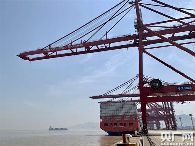 △寧波舟山港集裝箱碼頭正在裝運(yùn)集裝箱,總體產(chǎn)能逐漸恢復(fù)。(央廣網(wǎng)記者 李佳 攝)