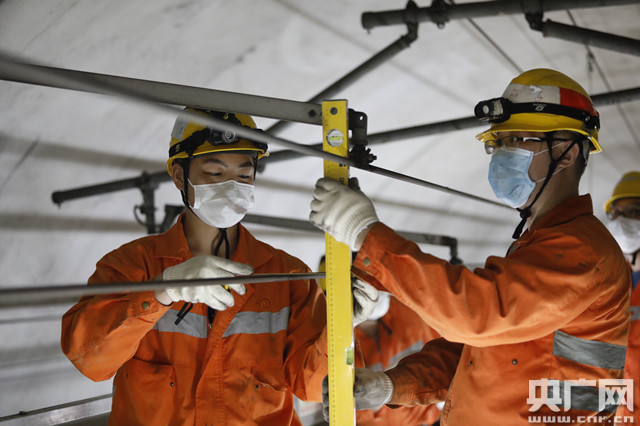 接觸網(wǎng)工測量錨段關(guān)節(jié)的水平距離(央廣網(wǎng)發(fā) 胡鵬 攝)