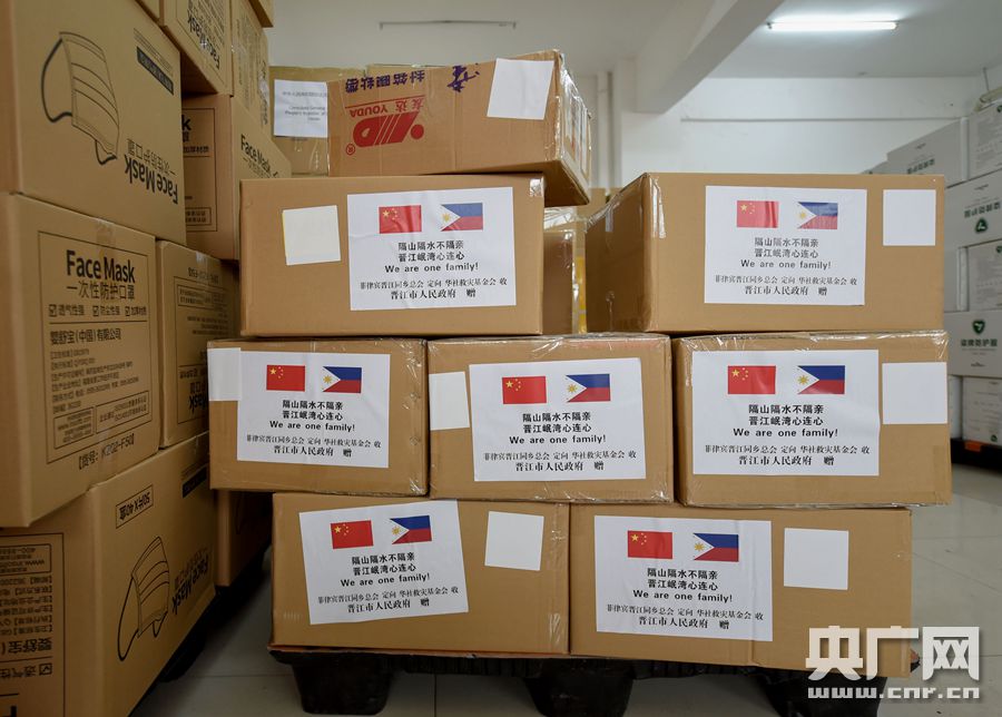 物資箱上分別貼著中國(guó)和菲律賓的國(guó)旗以及“晉江達(dá)沃一家親 攜手防疫心連心”、“山川異域 姊妹同心”等字,見(jiàn)證著晉江市與達(dá)沃市風(fēng)雨同舟、守望相助的深情厚誼和對(duì)未來(lái)友好關(guān)系的希冀。