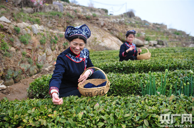 4月10日,當?shù)卮迕裨谇鄭u市嶗山區(qū)王哥莊街道長嶺茶園采摘春茶(央廣網(wǎng)發(fā) 王海濱攝)