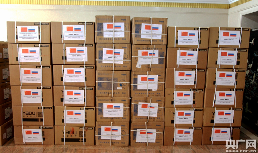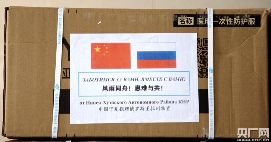 記者在現(xiàn)場看到,每箱發(fā)往俄羅斯圖拉州的物資外包裝上都貼有“風(fēng)雨同舟 患難與共”的中俄文標(biāo)語。當(dāng)前,俄羅斯疫情防控形勢日益嚴(yán)峻并面臨物資短缺等實際困難。該國圖拉州雖是寧夏的“新朋友”——于2019年10月正式締結(jié)國際友城。但在寧夏應(yīng)對疫情的關(guān)鍵時刻,圖拉州第一時間伸出援手,在短時間內(nèi)籌集醫(yī)療物資,以最快速度運抵,是寧夏收到的第一批國際友城捐贈物資。此次圖拉州疫情發(fā)生,寧夏及時籌集圖拉州最急缺的防控物資,包括醫(yī)用口罩、醫(yī)用外科口罩和防護服等。