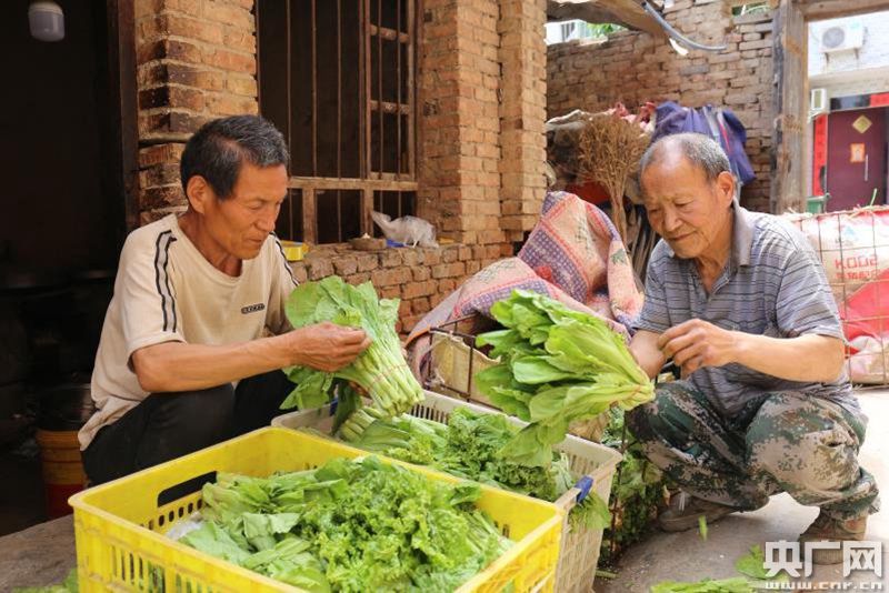 余明勝(左)整理即將出售的蔬菜(央廣網(wǎng)發(fā) 羅文博 攝)