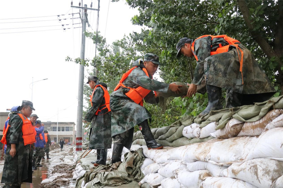 當地民兵正在加固加高子堤。(央廣網記者 徐鵬 攝)