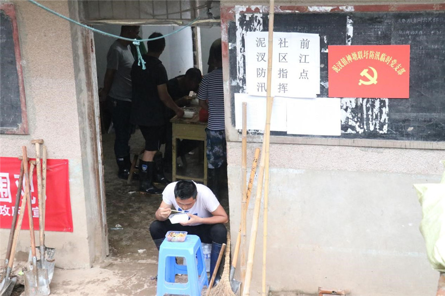 傍晚,一位工作人員蹲在防汛指揮點門口吃盒飯。(央廣網記者 徐鵬 攝)