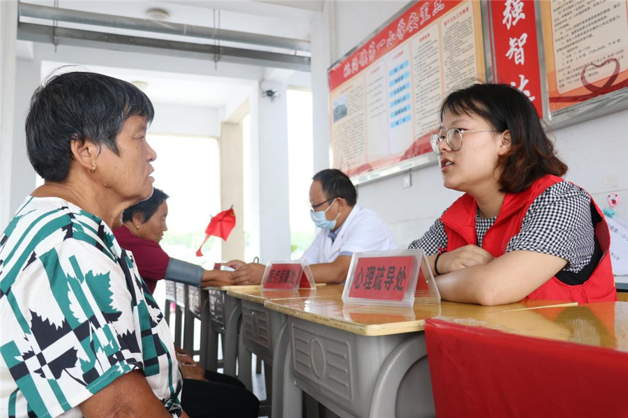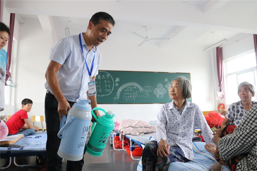 工作人員為安置點的老人送開水。(央廣網記者 徐鵬 攝)