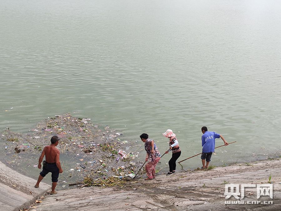 中江縣一水庫工作人員正在打撈漂浮物(央廣網(wǎng)記者 劉濤 攝)