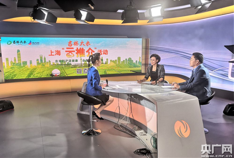 吉林省糧食和物資儲(chǔ)備局副局長劉紅霞(中)進(jìn)行“吉林大米”云推介(央廣網(wǎng)記者 劉源源 攝)