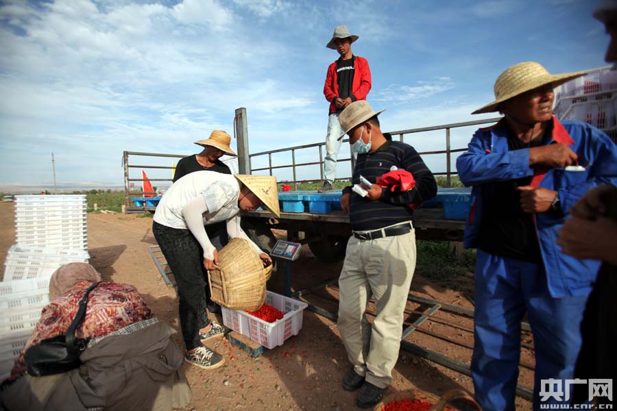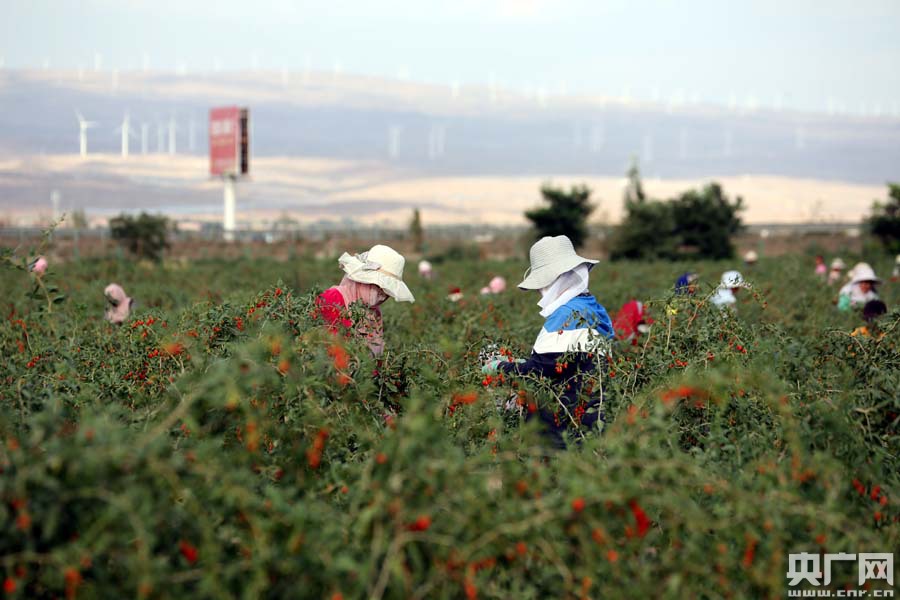 枸杞地中村民正在采摘(央廣網(wǎng)記者 郭長江 攝)