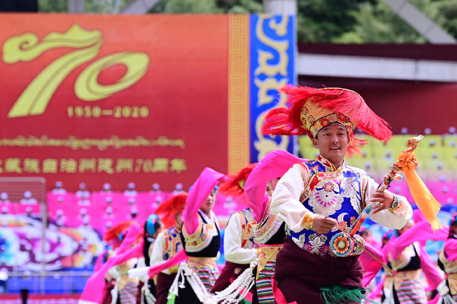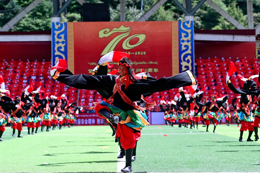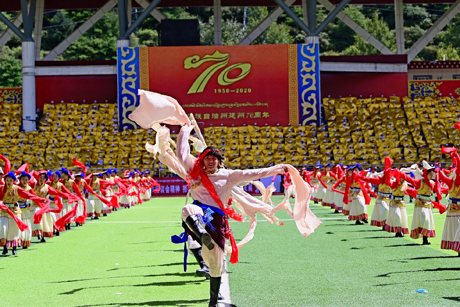 四川甘孜藏族自治州成立70周年慶祝大會群眾文藝演出(央廣網(wǎng)發(fā) 甘孜州委宣傳部供圖)