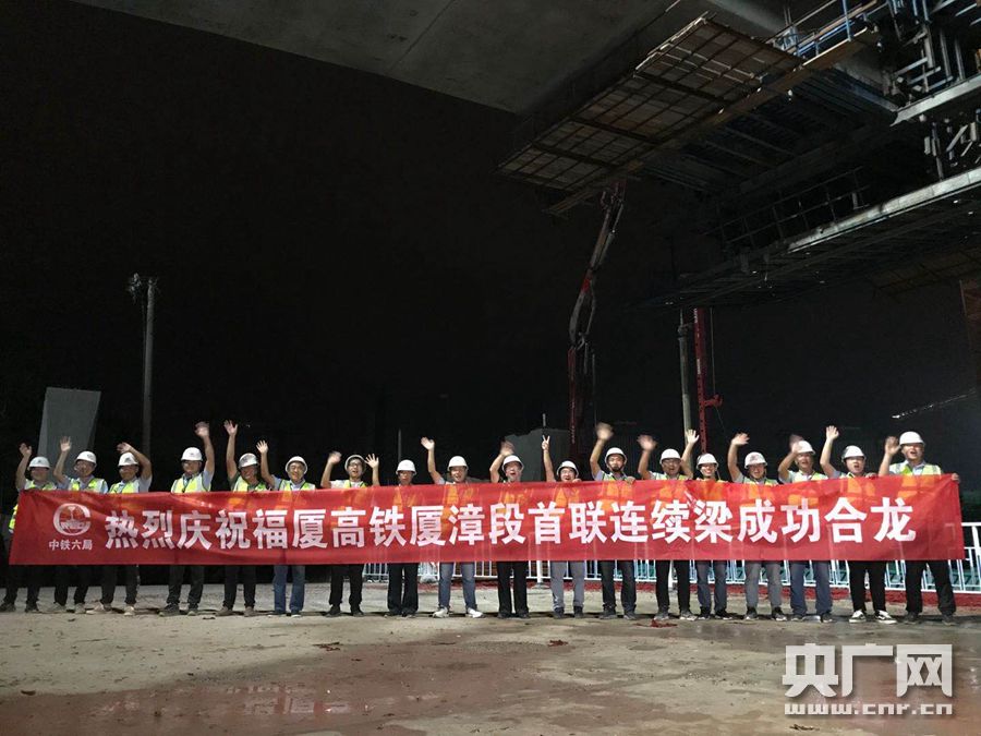 工程建設(shè)者們慶祝福廈高鐵廈漳段首聯(lián)連續(xù)梁成功合龍(央廣網(wǎng)記者 陳庚 攝)