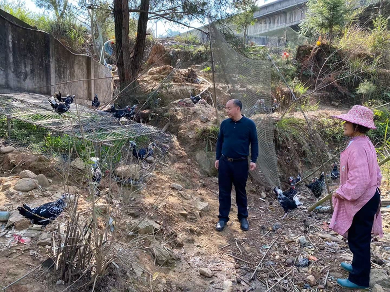 雷金榮和貧困戶查看貴妃雞(央廣網(wǎng)發(fā) 受訪者供圖)