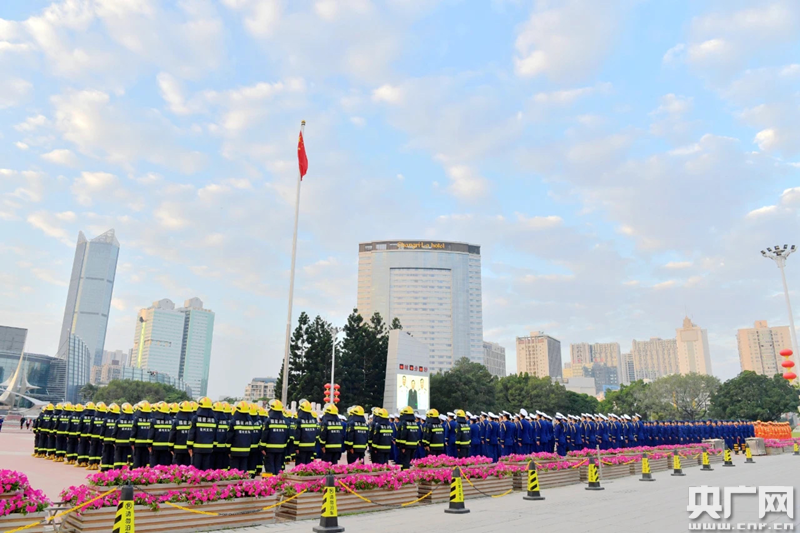 央廣網(wǎng)福州11月9日消息(記者張子亞)今天清晨,福州五一廣場(chǎng)前“關(guān)注消防 生命至上”巨型橫幅格外引人注目。天還沒(méi)亮,早有市民群眾三兩結(jié)伴來(lái)到五一廣場(chǎng),觀看莊嚴(yán)地升旗儀式。福建省消防救援總隊(duì)約600名指戰(zhàn)員在福州市五一廣場(chǎng)舉行升國(guó)旗暨重溫入隊(duì)誓詞儀式,強(qiáng)化消防指戰(zhàn)員和新入職消防員的職業(yè)認(rèn)同感、榮譽(yù)感。