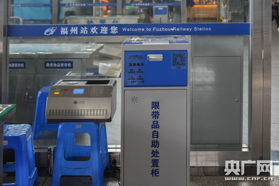 福州火車(chē)站安檢處置臺(tái)增設(shè)的限帶品自助處置柜。(央廣網(wǎng)發(fā) 通訊員供圖)