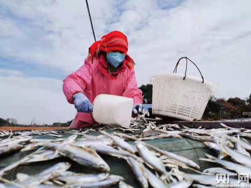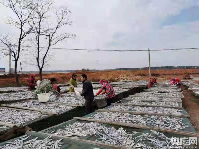 九江都昌縣薌溪鄉(xiāng)井頭村村民在翻曬小魚干(央廣網(wǎng)發(fā) 通訊員供圖)