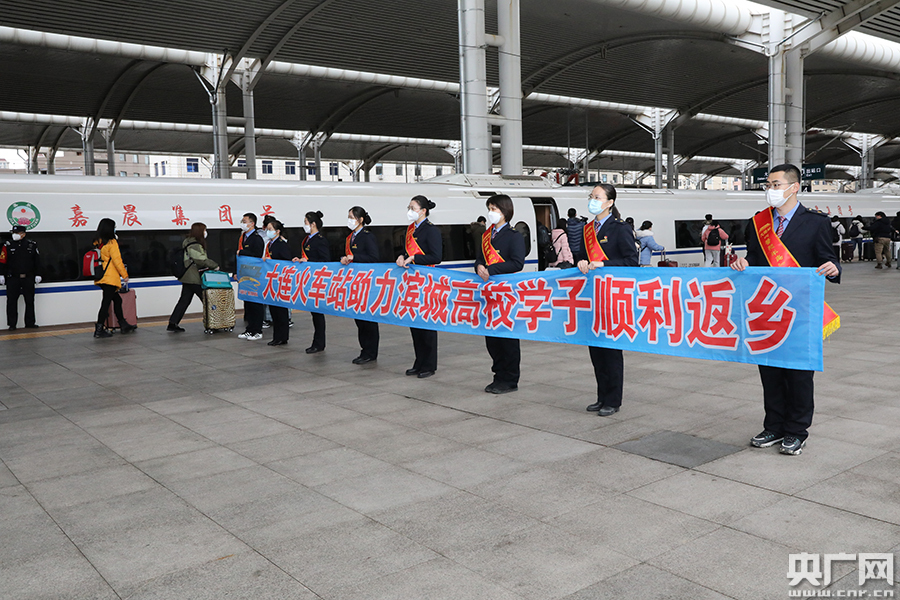 20日下午,大連火車站還將開行一趟學(xué)生專列到沈陽。東北財(cái)經(jīng)大學(xué)組織專車將學(xué)生從學(xué)校點(diǎn)對(duì)點(diǎn)送到火車站,火車站開通學(xué)生專用通道,在候車室規(guī)劃學(xué)生團(tuán)體候車專區(qū),提供溫馨服務(wù)和疫情防護(hù)宣傳。在列車上,大連鐵路公安處加派警力護(hù)乘,講解乘車安全常識(shí)。