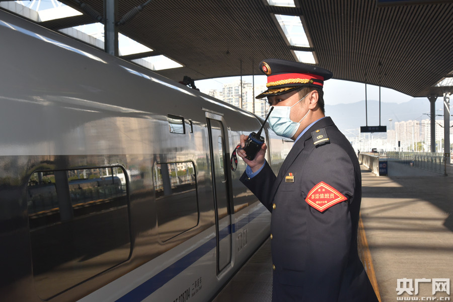 張海,是福州火車站客運(yùn)車間的一名客運(yùn)值班員,當(dāng)記者見到他的時候,他正在檢票口忙著疏導(dǎo)秩序!昂竺娴穆每筒灰獢D,時間來得及,大家要戴好口罩,保持一米間距”、“請?zhí)崆鞍焉矸葑C準(zhǔn)備好,閘門開啟后再往前走”“帶孩子的旅客,請孩子在前、大人在后,閘門開啟后要快速通過”……列車停止檢票后,張海又和同事交待了一下做了停檢后的注意事項(xiàng),這才有空轉(zhuǎn)過身來和記者聊了起來。