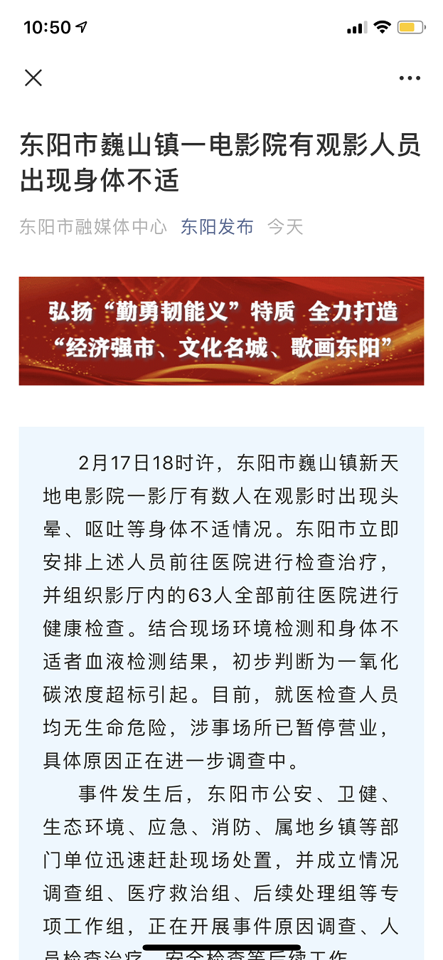 央廣網(wǎng)東陽2月18日消息(記者謝夢潔)2月18日,記者從“東陽發(fā)布”微信公眾號上了解到,2月17日18時許,浙江省東陽市巍山鎮(zhèn)新天地電影院一影廳有數(shù)人在觀影時出現(xiàn)頭暈、嘔吐等身體不適情況。東陽市立即安排上述人員前往醫(yī)院進(jìn)行檢查治療,并組織影廳內(nèi)的63人全部前往醫(yī)院進(jìn)行健康檢查。