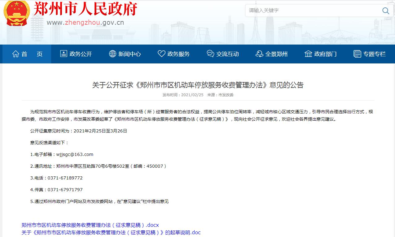 關于公開征求《鄭州市市區(qū)機動車停放服務收費管理辦法》意見的公告(截圖來源于鄭州市人民政府網(wǎng)站)